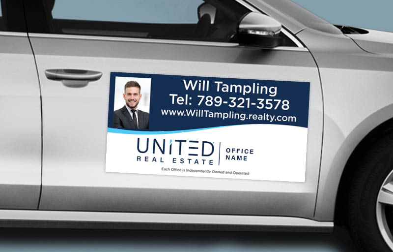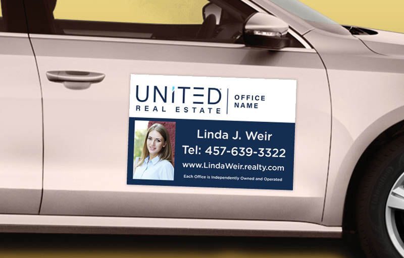 Car magnets are a versatile solution for real estate professionals who want to increase their visibility and name recognition. All of our magnets are printed on a durable 30 mil magnet stock, with gloss coating on the front to ensure readability. These real estate car magnets are a great way to promote individual agents or an entire office. With our easy ordering process, you can have an official United Real Estate branded car magnet complete with your name, contact information, and even photo, at your doorstep in just a few days!