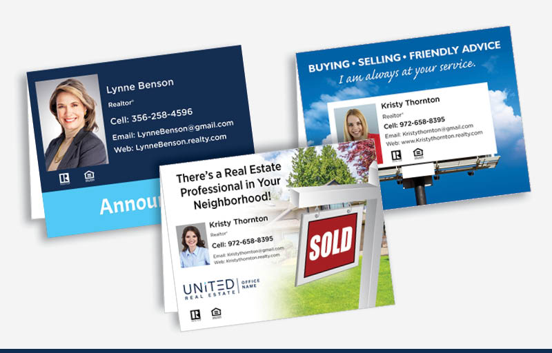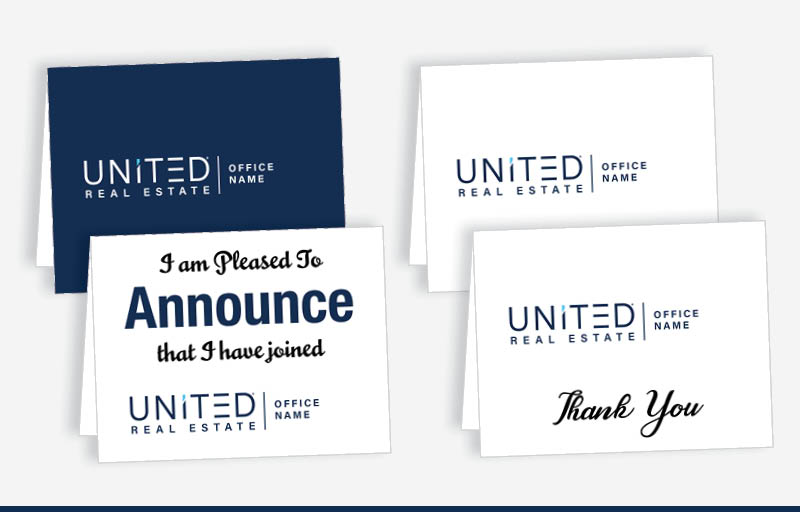 When it comes to marketing your real estate business, nothing beats the personal touch. United Real Estate folded note cards are an excellent way to keep in touch with past clients, set yourself apart with a promising prospect, or to say “Congrats!” after a close or “Thanks for your business!” when you land a listing. Our blank cards in your choice of bold United Real Estate colors are a great way to make your message your own, or you can give your direct mail marketing a special appeal with personalized folded note cards. Choose from standard or jumbo-sized cards, available in a wide range of designer styles and templates.
